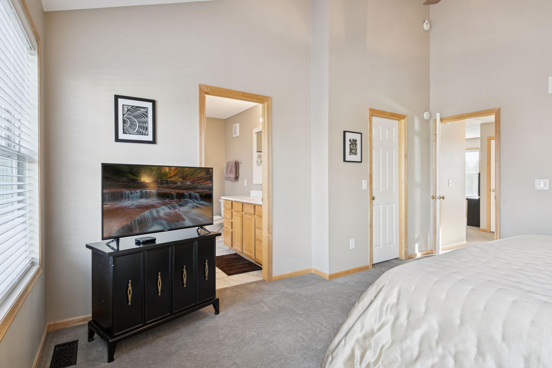 Upstairs, a versatile loft offers flexible space for a home office, reading nook, or additional living area, with the added convenience of an upper-level laundry closet just steps away. The vaulted primary suite has 14-foot ceilings, a walk-in closet, and an updated en suite bathroom. A second upper-level bedroom offers an additional upper level full bath. The lower-level bedroom adds even more flexibility and is ideal for a guest room, home gym, or office, located near the entry from the attached two-car garage.